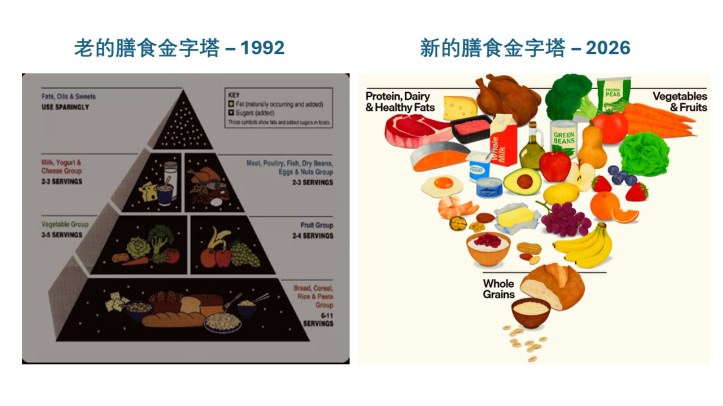 由美国卫生与公众服务部和农业部于2026年1月7日推出的新美国膳食金字塔,强调蛋白质、乳制品和健康脂肪的重要性,同时降低了谷物和添加糖的比重。倒置金字塔的结构将这些食物类别置于顶部,表明它们应占每日摄入的最大份额,而谷物和糖则位于底部。这一变化反映了从之前的“让美国健康重生”(Maha)议程的转变,该议程旨在应对与饮食相关的慢性疾病发病率上升。新的指南旨在支持美国的农民、牧场主及生产真实食物的公司,并为各个生命阶段提供量身定制的建议,确保各阶段的营养充足。